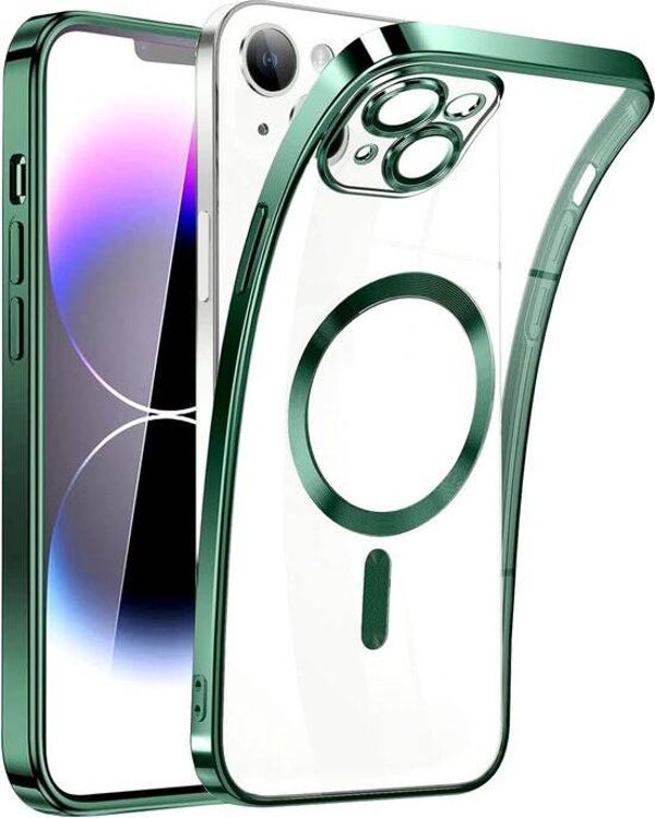 Coque transparente avec contour et cercle magnétique vert pour iPhone 15 Pro Max. Une protection en verre trempé pour les caméras arrières est intégrée dans la coque. Le cercle magnétique fonctionne avec un chargeur sans fil pour une charge rapide et facile. Le dos de la coque est fabriqué en acrylique qui est résistant aux rayures et chocs. Découpes précises pour une accès à tous les ports, boutons et commandes